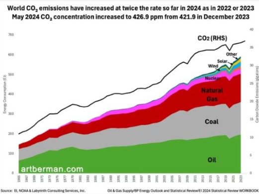 Pero estos datos reflejan sólo la energía eléctrica. Se afirma que existe una constante dependencia global del carbono fósil, por lo que no hay progreso alguno y no hay esperanzas de que la economía mundial pueda estar libre de carbono en 2050. Del lado del CO2 y el consumo de energía, las emisiones están incrementando considerablemente; de hecho, de lo que va del año 2024 se ha visto un aumento más intenso que en comparación con años anteriores. (dato crucial 3)