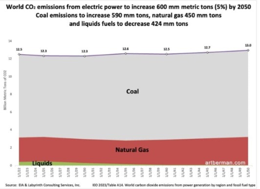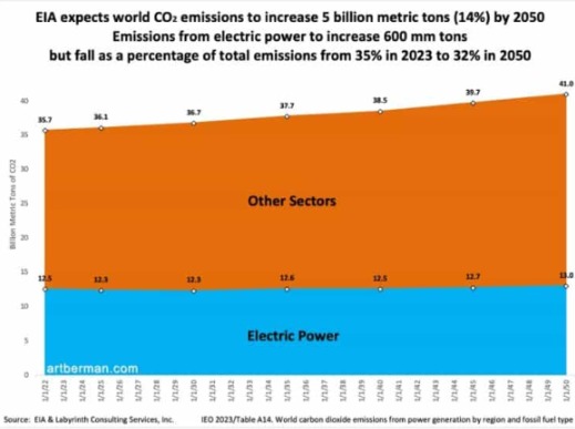 7) La AIE espera que las emisiones mundiales de CO2 aumenten en 5 mil millones de toneladas métricas (14%) para 2050. Las emisiones de energía eléctrica aumentarán en 600 millones de toneladas, pero caerán como porcentaje de las emisiones totales de 35% en 2023 a 32% en 2050.