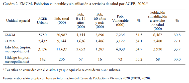 17) Para obtener a la población vulnerable de la Zona Metropolitana y Ciudad de México se consideró la información del Censo de Población y Vivienda de 2020, a partir de las áreas geo-estadísticas básicas (AGEB) urbanas; en este caso no están contemplados las AGEB rurales, lo cual se representa en la figura 8. En 2020, el área urbana de la principal metrópoli del país contaba con 21 millones de habitantes, siendo al menos una tercera parte considerada dentro de los grupos vulnerables ante las altas temperaturas.