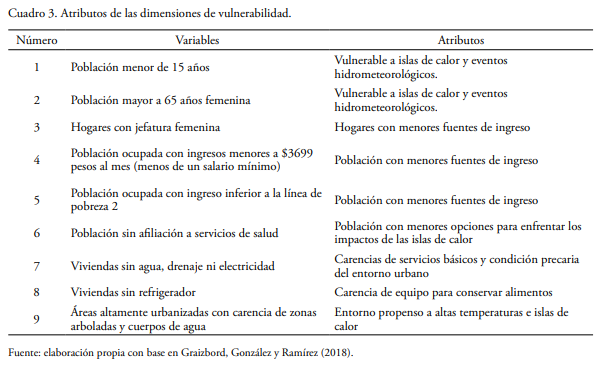 Conforme a La Ley General de Desarrollo Social, se define como grupos sociales vulnerables a “aquellos núcleos de población y personas que, por diferentes factores o la combinación de ellos, enfrentan situaciones de riesgo o discriminación que les impiden alcanzar mejores niveles de vida y, por lo tanto, requieren de la atención e inversión del Gobierno para lograr su bienestar”. En el estudio sólo se incluyó n a la población infantil de 0 a 14 años y las personas adultas mayores de 65 años (dato crucial 16), como los individuos más susceptibles a los estragos por las altas temperaturas debido a sus condición física sin considerar el factor socioeconómico.