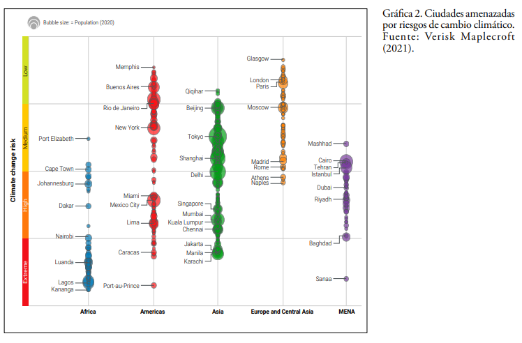 El cambio climático genera gran preocupación a nivel mundial (dato crucial 4) y una gran cantidad de población urbana se encuentra sujeta a las afectaciones por riesgos ambientales (dato crucial 5), como el deterioro en la calidad del aire, las lluvias intensas, los huracanes y la disponibilidad de agua. Además, algunas otras ciudades se encuentran con afectaciones de altas a extremas por factores en los que se consideran la contaminación atmosférica, escasez de agua, estrés por calor extremo, los ciclones tropicales y la sequía.