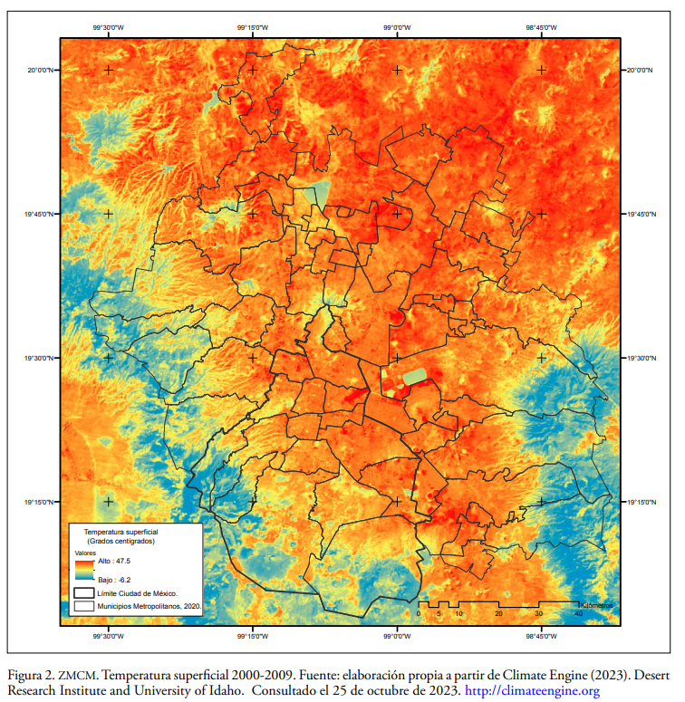 12) Para Ciudad de México, la temperatura en la zona urbana aumenta con respecto a la zona rural hasta 5 °C en la temporada seca. En la figura 4 se muestra la isla de calor dentro de Ciudad de México.