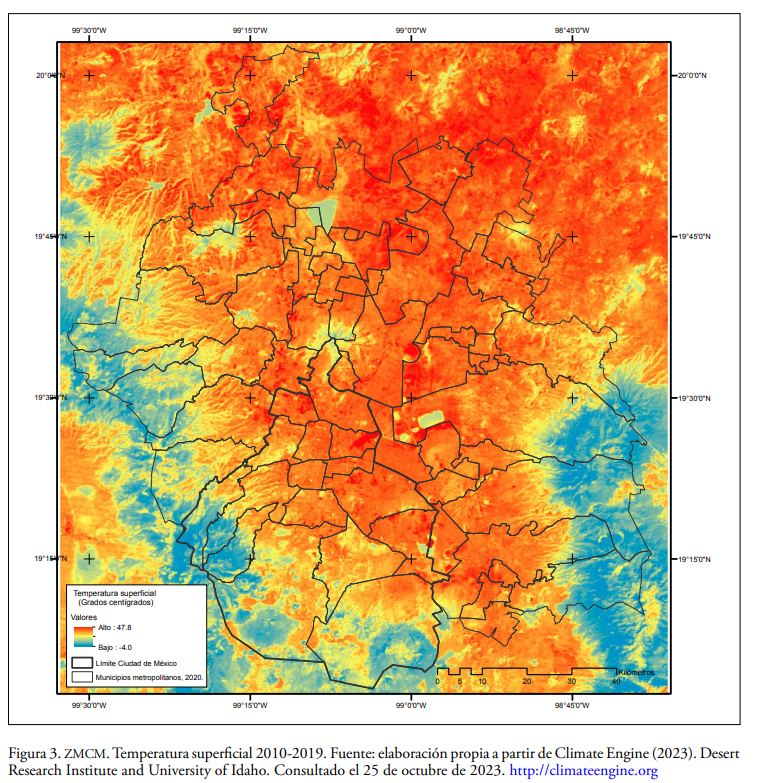 15) En la figura 7 se muestra el promedio de temperatura superficial de 2010 a 2019. Pese a su parecido a la figura anterior, se encuentran diferencias como un ligero aumento tanto en el gradiente como en la extensión de algunas zonas, en especial en aquellas del oriente y norte de los municipios metropolitanos pertenecientes a Estado de México. En el caso de las alcaldías de Ciudad de México, Azcapotzalco, Venustiano Carranza e Iztapalapa, registran una mayor temperatura.
