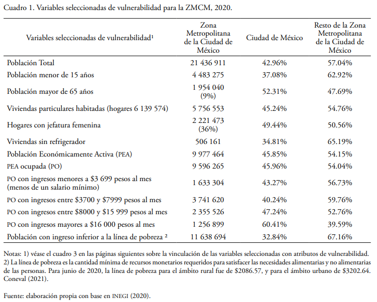 3) En Ciudad de México, al menos la mitad de sus habitantes registró ingresos por debajo de la línea de pobreza, de acuerdo con datos de Coneval para 2020, con un muy bajo nivel de resiliencia, aunque potencialmente con una importante capacidad adaptativa. En la figura 1 se muestran las variables seleccionadas de vulnerabilidad para la Zona Metropolitana de la ciudad de México (ZMCM) en 2020.