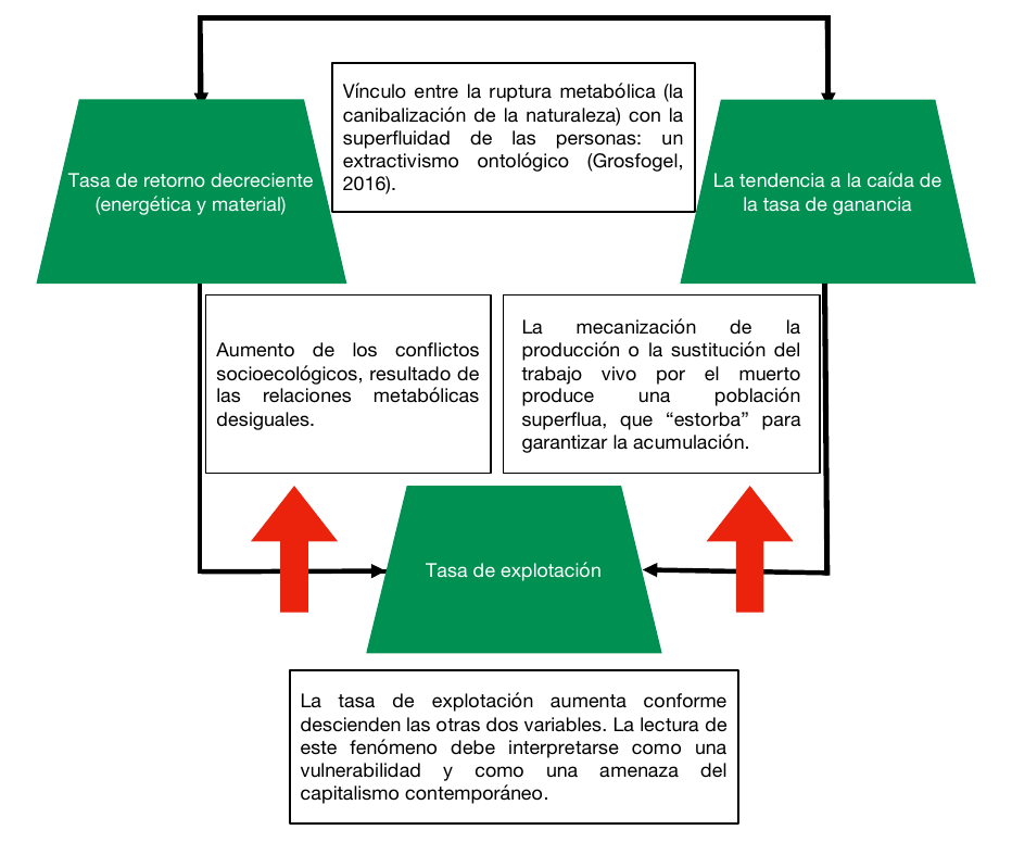 Figura 1. Interacción entre las tasas de retorno decreciente, la tendencia a la caída en las ganancias y la explotación