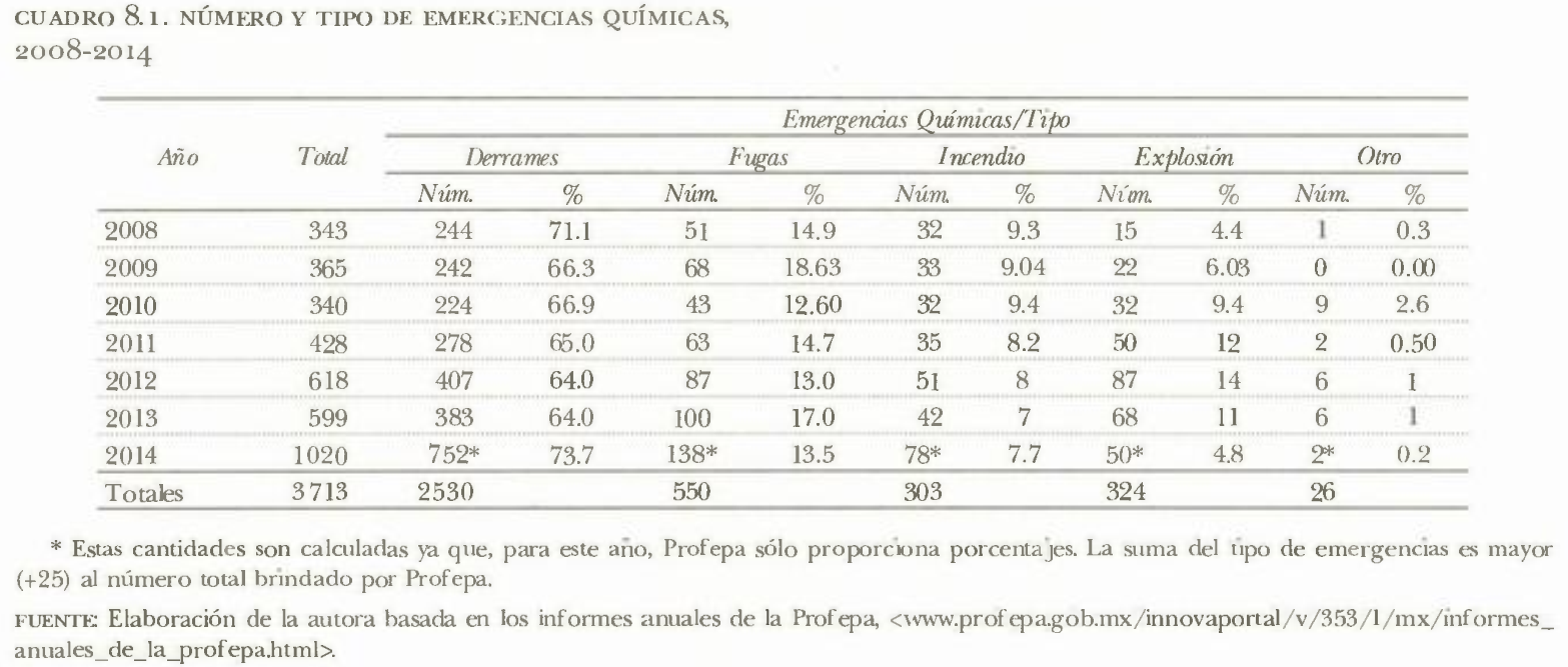 La Procuraduría Federal de Protección al Ambiente (Profepa) señala que en México, cada año, ocurre un promedio de 600 emergencias ambientales asociadas con materiales peligrosos, aunque en 2014 la cifra se incrementó, alcanzando un total de 1 020 emergencias químicas. De 2008 a 2014 el tipo de accidente que predomina son los derrames. A estos le siguen las fugas, incendios y explosiones. Las principales sustancias que las causaron fueron los hidrocarburos y derivados. Asimismo, más de 97% de las emergencias químicas ocurrieron en el medio terrestre, y el resto en el medio marino (dato crucial 4).