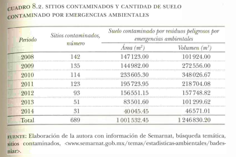 1) De acuerdo con el Informe de la Situación del Medio Ambiente en México, publicado en 2014 por la Secretaría de Medio Ambiente y Recursos Naturales (SEMARNAT), de 2008 a 2014 se registraron 3 713 sitios contaminados a causa de las emergencias químicas.