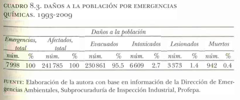 La autora sostiene que las emergencias químicas en México han aumentado en número y frecuencia con el pasar de los años, generando sitios de desastre (dato crucial 1). Esto se debe no sólo a la comercialización de productos químicos en el país sino también a la ausencia de una política ambiental de prevención y atención integral a los problemas que generan los desastres químicos. De acuerdo con la autora, los accidentes provocados por la industria química en México afectan dos esferas principales: la salud humana y el medio ambiente; también conducen a pérdidas materiales y humanas y la erosión de la salud.