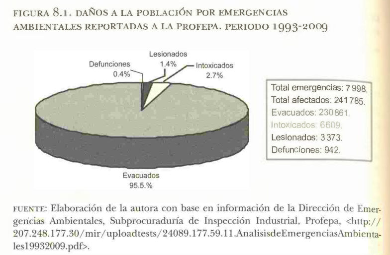 Los daños a la población también han sido significativos. De las 79 998 emergencias químicas registradas por Profepa en el período 1993-2009, hubieron afectaciones hacia 241 785 personas (dato crucial 6), entre la cuales se encuentran evacuados, intoxicados, lesionados y defunciones.
