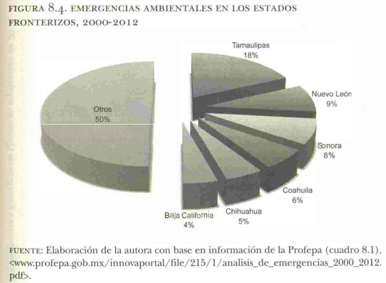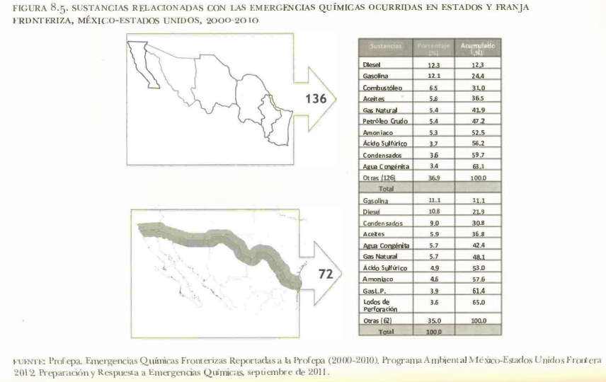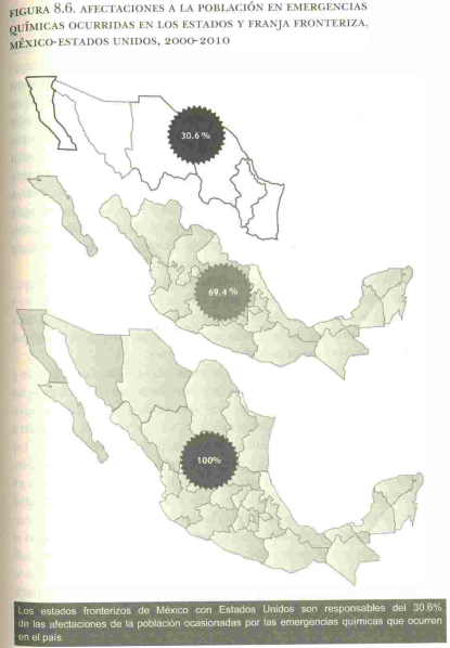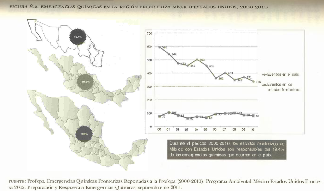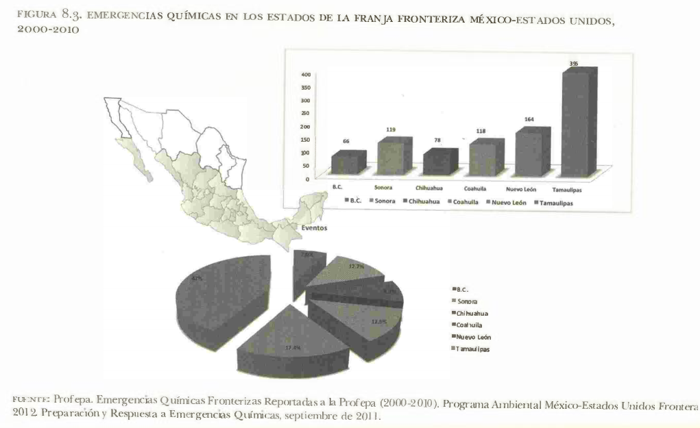 De 2000 a 2010 se reportaron a la Profepa 940 emergencias químicas en la frontera norte, las cuales representan 19% del total de las que se presentaron en todo el país (dato crucial 7). Entre las ciudades más afectadas se encuentran Tijuana y Mexicali (Baja California), San Luis Río Colorado, Nogales, Naco y Agua Prieta (Sonora), Las Palomas, Ciudad Juárez y Ojinaga (Chihuahua), Ciudad Acuña y Piedras Negras (Coahuila), así como Nuevo Laredo, Río Bravo y Matamoros (Tamaulipas). De las 940 emergencias, 395 ocurrieron en Tamaulipas, el estado con más casos reportados; a este le siguen Nuevo León con 164 y Coahuila con 118 casos (dato crucial 8).