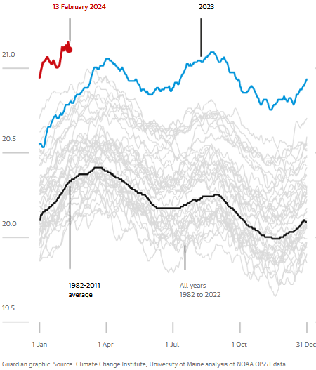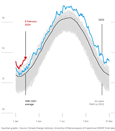 Meteorólogos reportan que febrero de 2024 se encamina a batir nuevos récords de temperaturas. Ello se explica por los efectos antropogénicos del cambio climático, así como los estragos de "El Niño", un fenómeno meteorológico natural que tiende a aumentar las temperaturas globales, tanto de la superficie terrestre como marina.