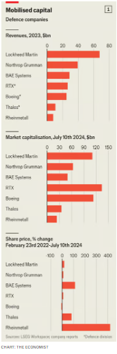 4) Los gráficos "Mobilised capital" (capital movilizado) muestran a las compañías de defensa occidentales ordenadas de acuerdo a (1) sus ingresos en 2023, (2) su valor en bolsa el 4 de julio de 2024, (3) el cambio del precio de sus acciones del 24 de febrero de 2022 al 4 de julio de 2024. En ellos es apreciable una brecha entre las ventas de las estadounidenses -Lockheed Martin, Boeing, RTX y Northrop Grumman- y las europeas -Thales, BAE y Rheinmetall-.