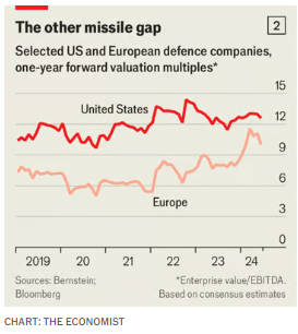 8) El gráfico "The other missile gap" (La otra brecha del misil) muestra -comparando valor de mercado, deuda neta y ganancia bruta operativa- la reducción de la diferencia entre la valorización de las compañías europeas y estadounidenses.