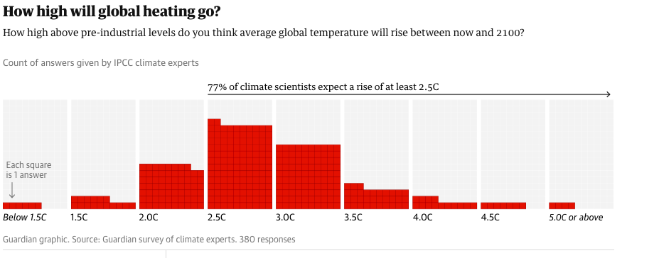 Una encuesta realizada por The Guardian a científicos climáticos, reveló que, en su percepción, la temperatura global rebasará el límite de 2.5 °C, por encima de los niveles preindustriales. Ante esto, los encuestados expresan su preocupación porque, a pesar de la evidencia científica, los gobiernos siguen siendo muy laxos en políticas para la mitigación y la adaptación climática (datos cruciales 1 y 2).