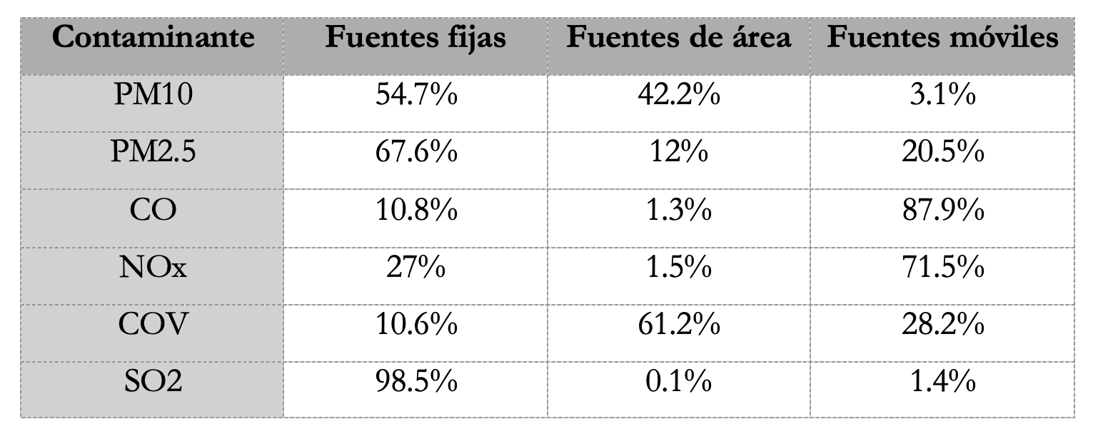 Los orígenes de estos puntos de emisión se categorizan en fuentes fijas, fuentes de área y fuentes móviles. La primera categoría se refiere a espacios estacionarios centralizados, tales como fábricas químicas y de refinación de combustóleo; la segunda, a emisiones dispersas de menor tamaño a las fijas, pero que en multiplicidad pueden ser problemáticas como los puntos de construcción de vivienda; por último, la tercera tiene que ver con la quema de combustibles fósiles de automotores de transporte público, privado individual y de carga. Estas últimas emisiones pueden agravarse debido a la congestión vial (Martínez Muñoz et al., 2020).