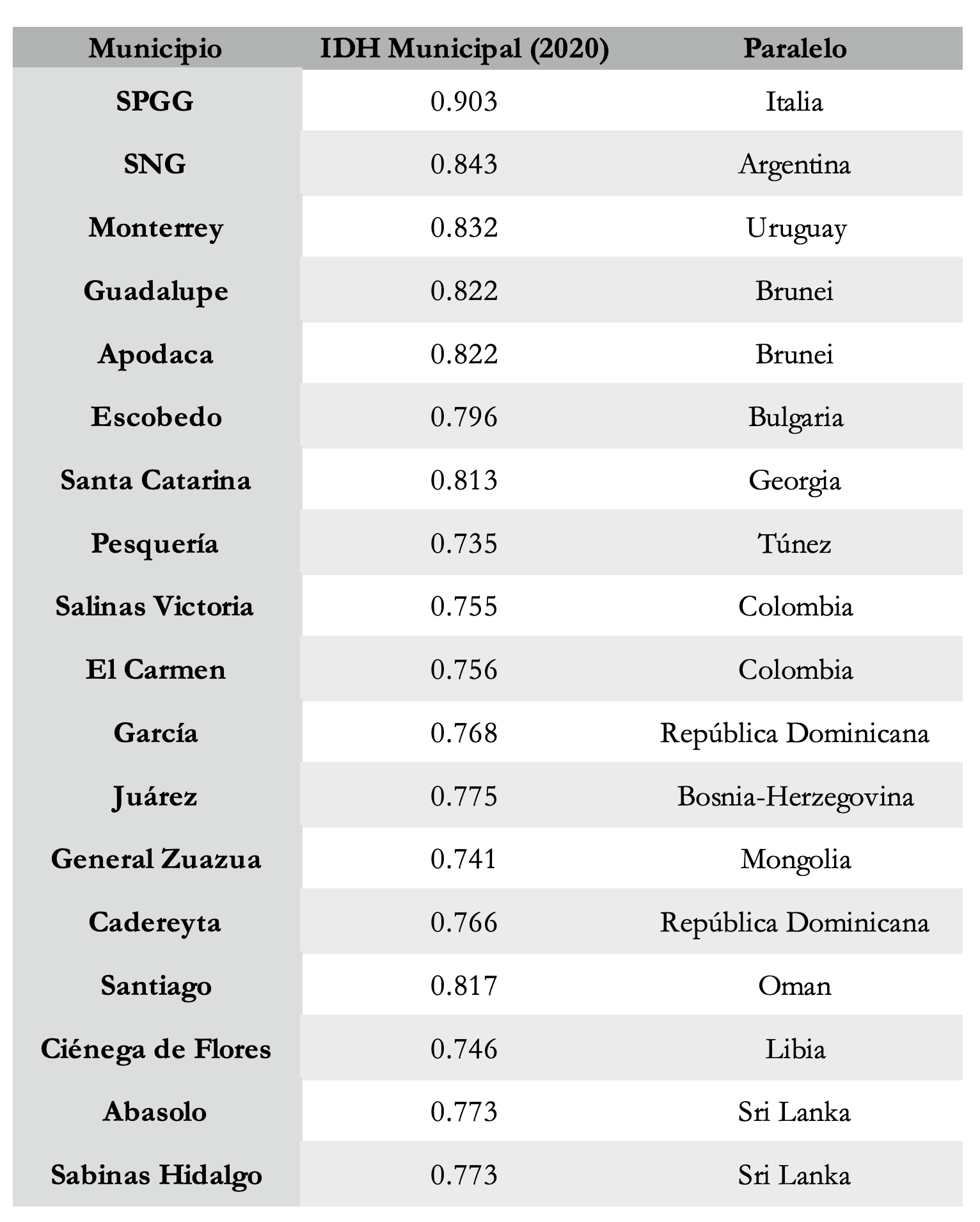 A nivel social, la ZMM muestra una sociedad de contrastes extremos. De los 18 municipios que componen la metrópoli, dentro del imaginario de la población están los históricos seis que componen el núcleo de la industrialización: Monterrey, San Pedro Garza García (SPGG), Apodaca, Guadalupe, San Nicolás de los Garza (SNG) y Escobedo. Entre estos también hay diferencias que pueden ser analizadas por sus índices de desarrollo humano (IDH). Nuevo León es una de las entidades que reportan desempeños adecuados en atención a la salud y educación, así como mejores niveles de ingreso, con buenos resultados en los seis municipios mencionados. No obstante, la ZMM presenta fuertes contrastes entre los municipios que la conforman: si bien un municipio como SPGG puede presumir un IDH cercano al de Italia, otros municipios cuentan con índices similares a los de Libia o Sri Lanka (Tabla 2).