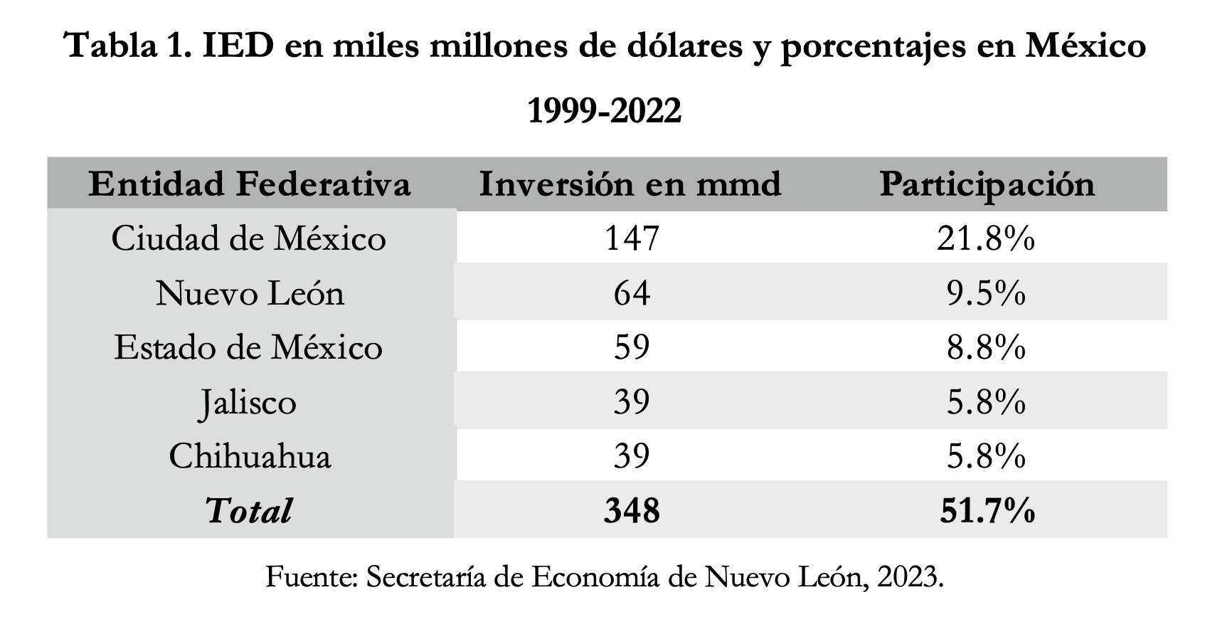Este panorama económico es una coordenada cultural destacada en la entidad. Desde el Porfiriato, la actividad económico-industrial de la ciudad fue central en el desarrollo de la vida material y de los marcos identitarios de sus habitantes. El imaginario del “regiomontano” intentó distinguirse del relato nacional a partir de una vida “de trabajo”, que puede resumirse en el lema que decoró al escudo municipal de Monterrey desde principios del siglo XX: “El trabajo templa el espíritu”. Fue durante el desarrollo estabilizador, de los años cuarenta y cincuenta del siglo XX, que se establecieron algunas de las empresas que hasta el día de hoy rigen la metrópoli, y cuyo impacto se profundizó a partir de la entrada en vigor del Tratado de libre comercio de Norteamérica en 1994 (Nuncio, 2023). De acuerdo con el Reporte 2022 de Resultados de Inversión Extranjera Directa del estado de Nuevo León, la entidad es la segunda con más IED a nivel nacional en el periodo 1999-2022, con una participación de 9.5% del total nacional (Tabla 1).