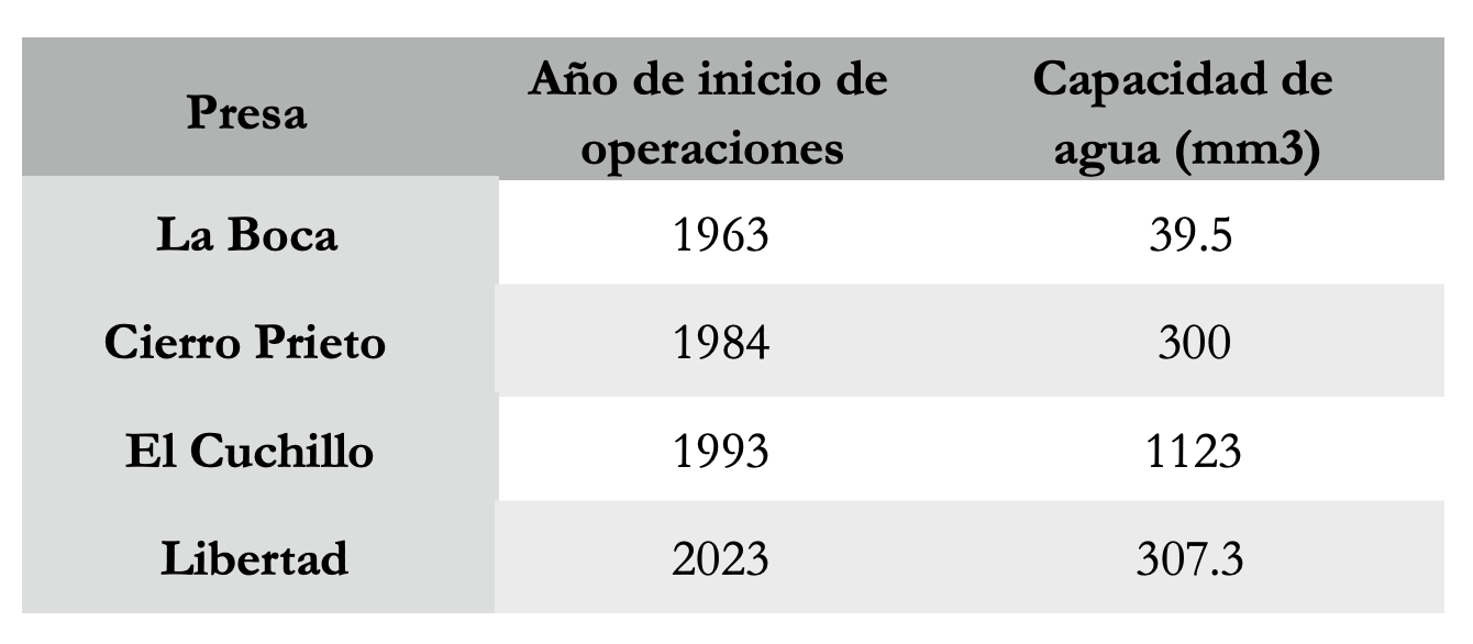 Tabla 3. Información sobre las cuatro presas actualmente existentes en Nuevo León