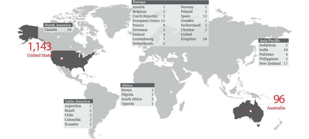 Fuera de los acuerdos internacionales, existen diversas normas y principios que reconocen a las entidades naturales como sujetos con valor intrínseco independiente de los intereses humanos. Anette Putzer y sus colaboradores (2022) han registrado, hasta 2021, ejemplos a nivel local y nacional en 39 países, que toman la forma de disposiciones constitucionales, acuerdos de tratados, estatutos, ordenanzas locales y decisiones judiciales . Además, Elisa de Wit, Sonali Seneviratne y Huw Calford elaboraron un documento llamado “Climate Change Litigation Update” (2020), que reúne registros de 1 444 demandas por motivos medioambientales contra corporaciones y gobiernos en todo el mundo hasta el 2024. La imagen a continuación ilustra esta conflictividad.