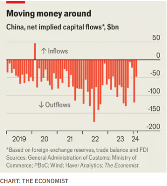 3) El gráfico "Moving money around" (moviendo el dinero) muestra los flujos netos implícitos de capital en China desde 2019 hasta 2024. Puede observarse un aumento en las fugas de capital. Las redes de servicios financieros ilícitos que operan en China son una popular herramienta comúnmente usada para evadir controles y trasladar grandes fortunas al extranjero.