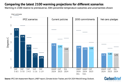 Las proyecciones del PNUMA para las políticas actuales coinciden en gran parte con el escenario SSP2-4.5 del IPCC, que representa una trayectoria intermedia. Sin embargo, en los últimos años se ha abierto una brecha entre las estimaciones del PNUMA y las de la Agencia Internacional de Energía (IEA): mientras las del PNUMA han aumentado, las de la IEA han disminuido, marcando una diferencia relevante en la evaluación de riesgos futuros.