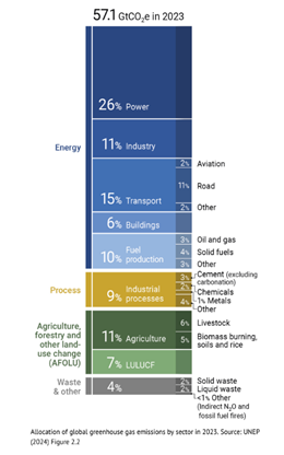 El incremento de las emisiones se debe, en gran medida, al consumo energético, las actividades industriales y los cambios en el uso del suelo. La generación de electricidad fue la mayor fuente, con 26% del total, seguida por el transporte, la industria y la producción de combustibles fósiles. La aviación registró el mayor aumento proporcional, impulsada por la recuperación tras la pandemia.