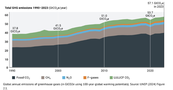 6.- Las emisiones globales aumentaron 1.3% (0,7 GtCO₂e) en 2023 en comparación con 2022, un ritmo de crecimiento significativamente más rápido que el promedio de la década anterior (2010-2019, con 0.8 GtCO₂e por año).