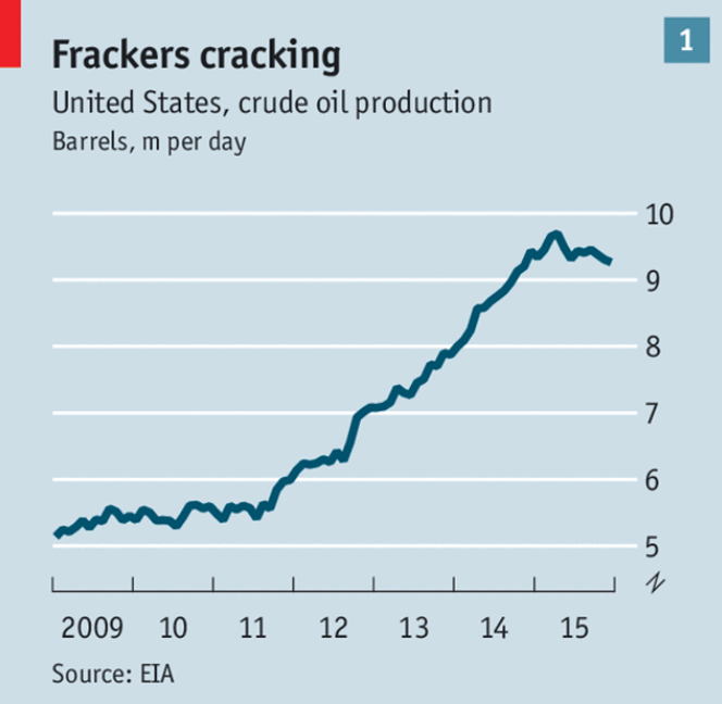 Según la EIA, la producción de petróleo estadounidense en 2015 fue de 9.3 millones de barriles al día, una cifra menor a la del año anterior por primera vez desde 2011. El descenso es explicado por la caída de la producción en Texas y Dakota del Norte, principales estados donde se practica la fractura hidráulica.