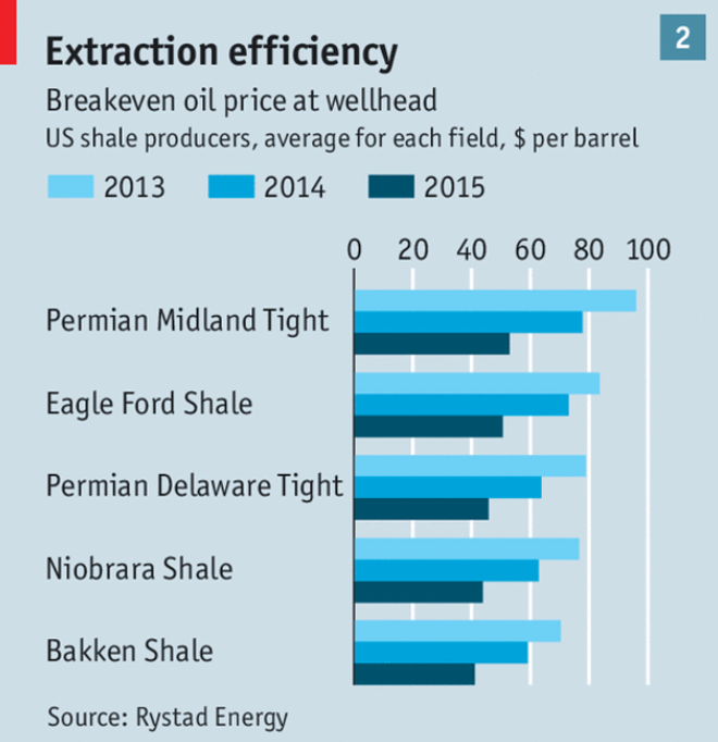 La producción de petróleo shale, teóricamente, es rentable con un precio de 40 a 45 dólares, debido a la caída de los costos de perforación.